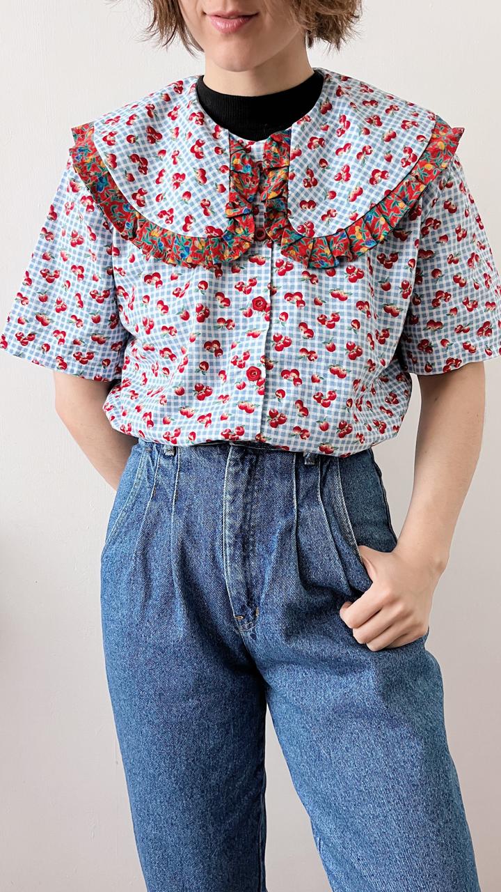 Modelo Único de Blusa con diseños de manzanas y cuadrille, confeccionada con tela