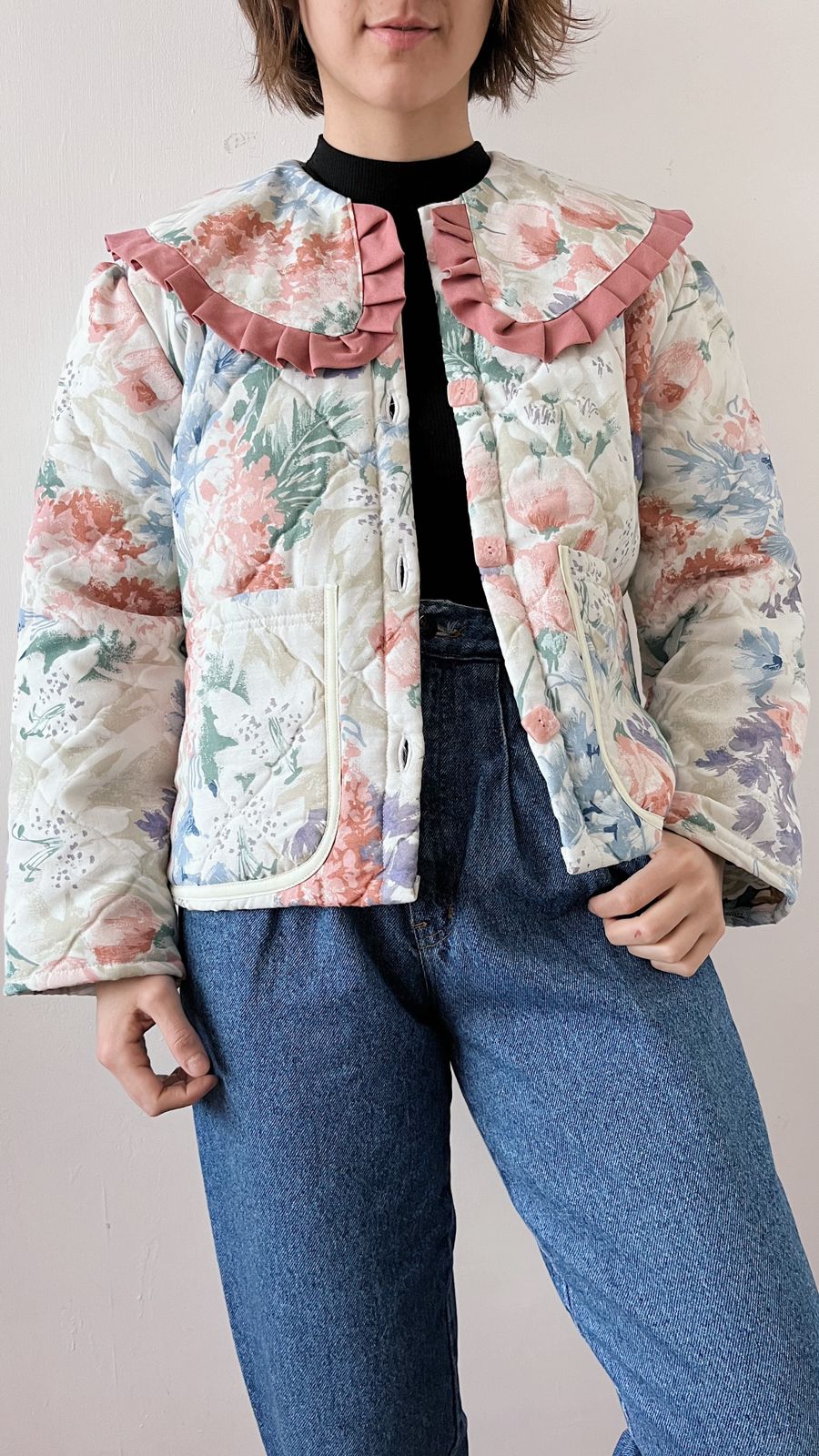 Modelo Único de Chaqueta floreada con tonos rosados , confeccionada con cubrecamas americano secondhand, acolchado. Cuenta con bolsillos frontales.
