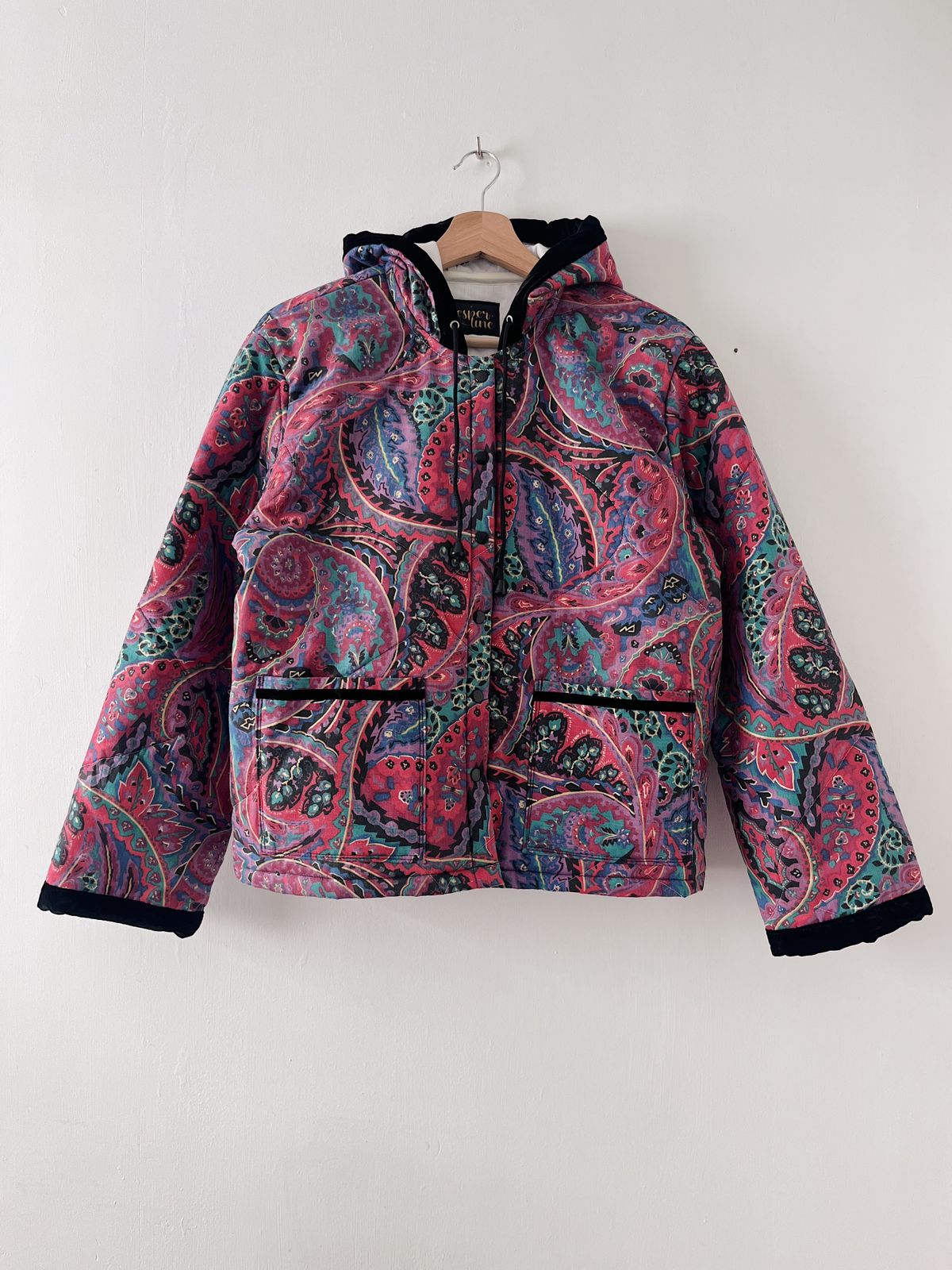 Modelo Único de Chaqueta con diseño Paisley, con delicados detalles velvet negro, confeccionada de un cubrecamas americano secondhand.