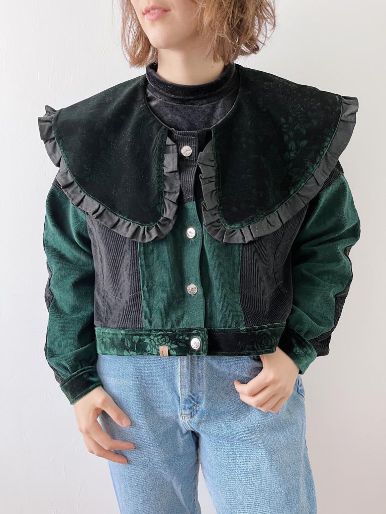Modelo Único de Chaqueta cotelé negro y verde con cuello, puños y pretina velvet verde con rosas.